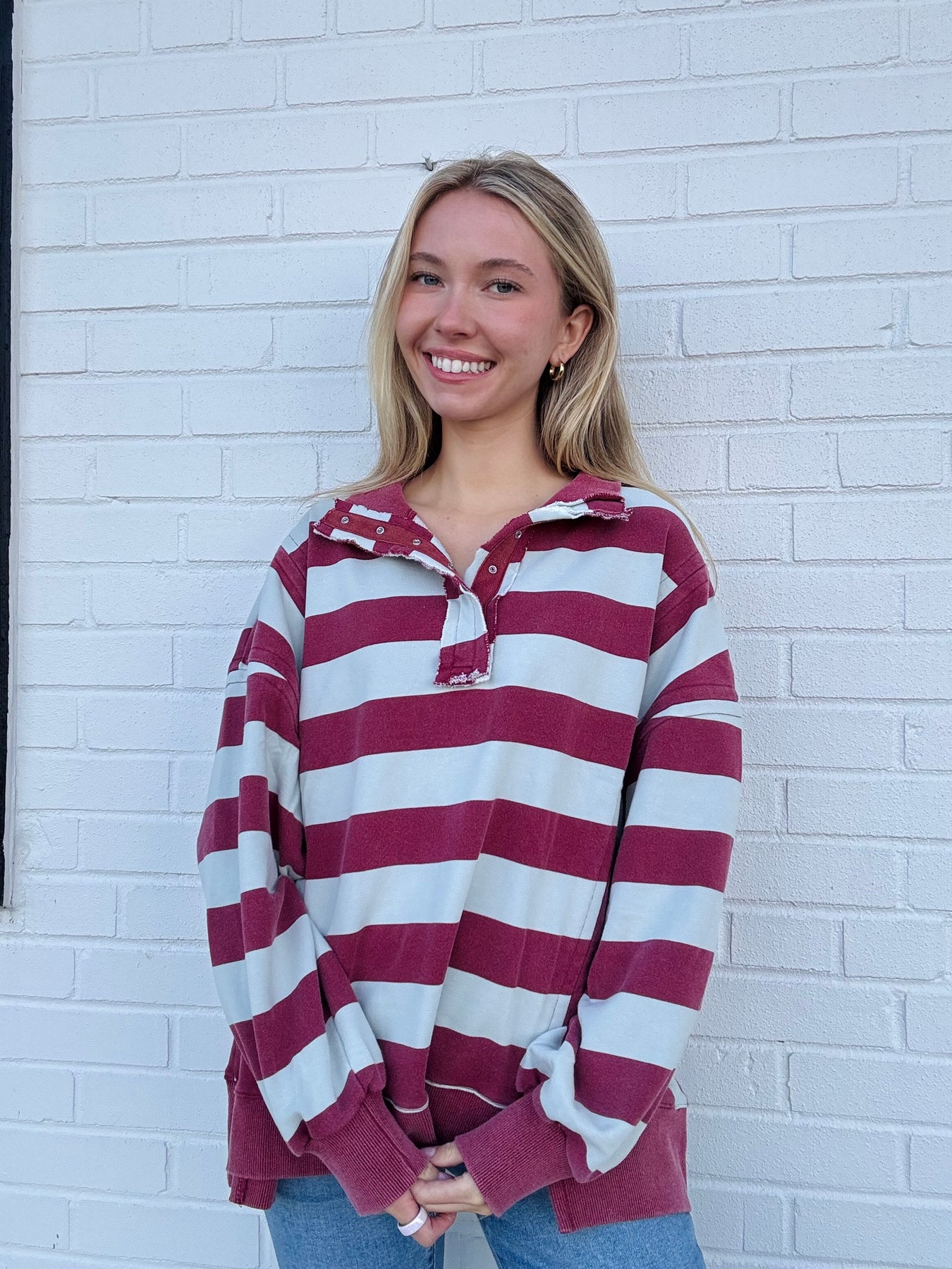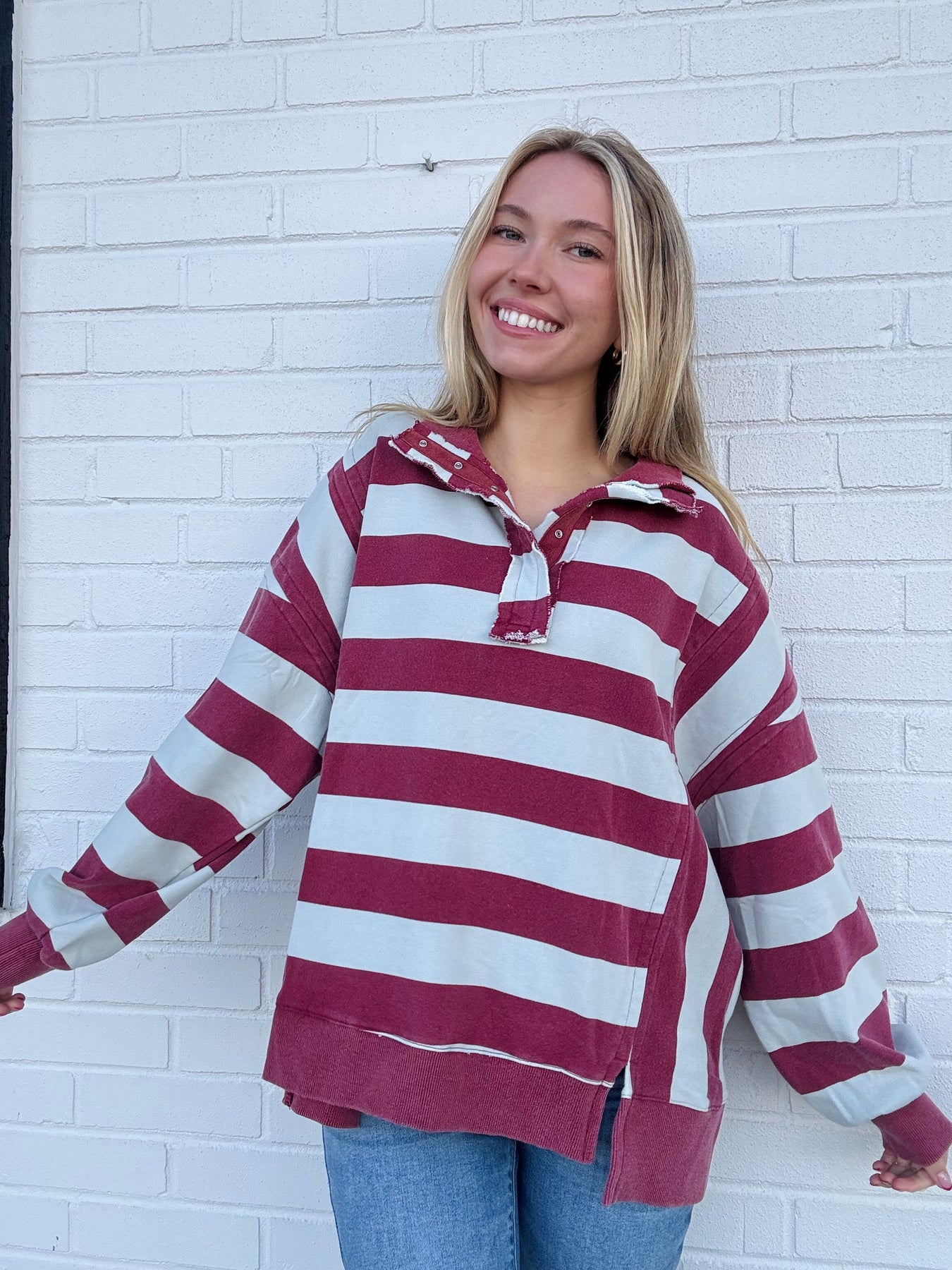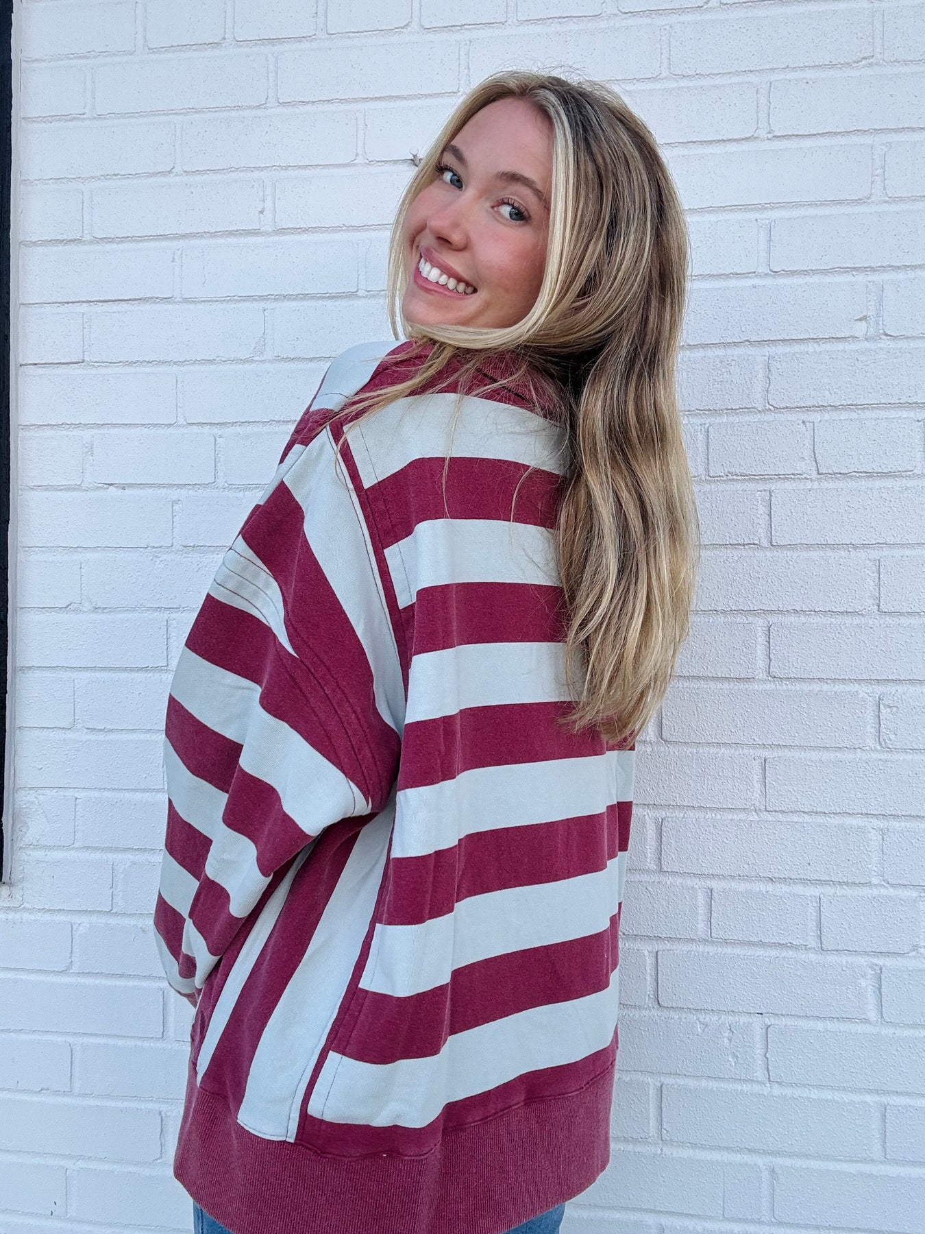 Everyone needs this adorable sweater! The gray and red stripes make this sweater perfect for any occasion whether it be game days or coffee with the girls- It's perfect!