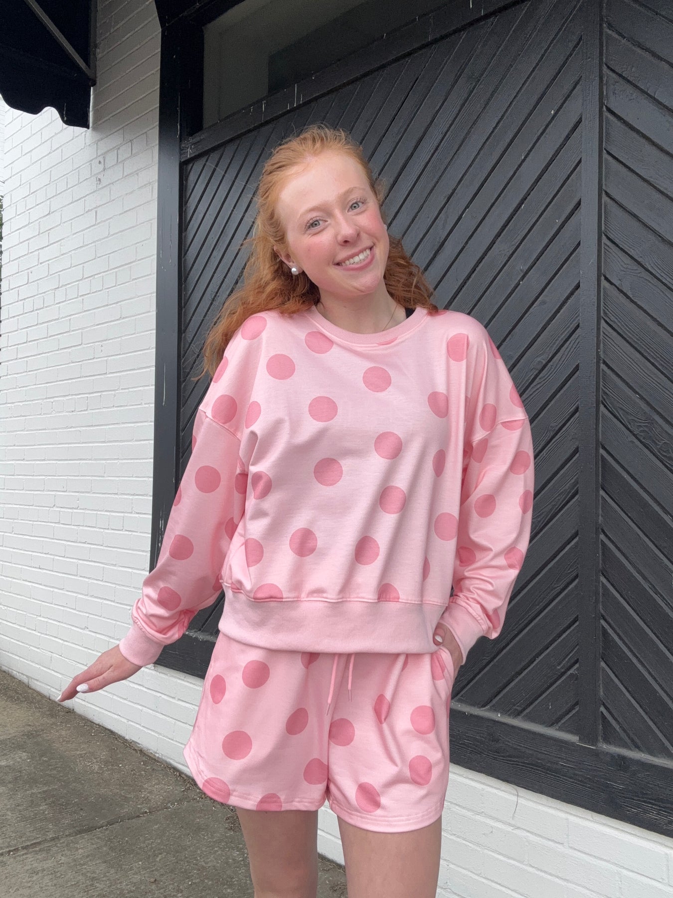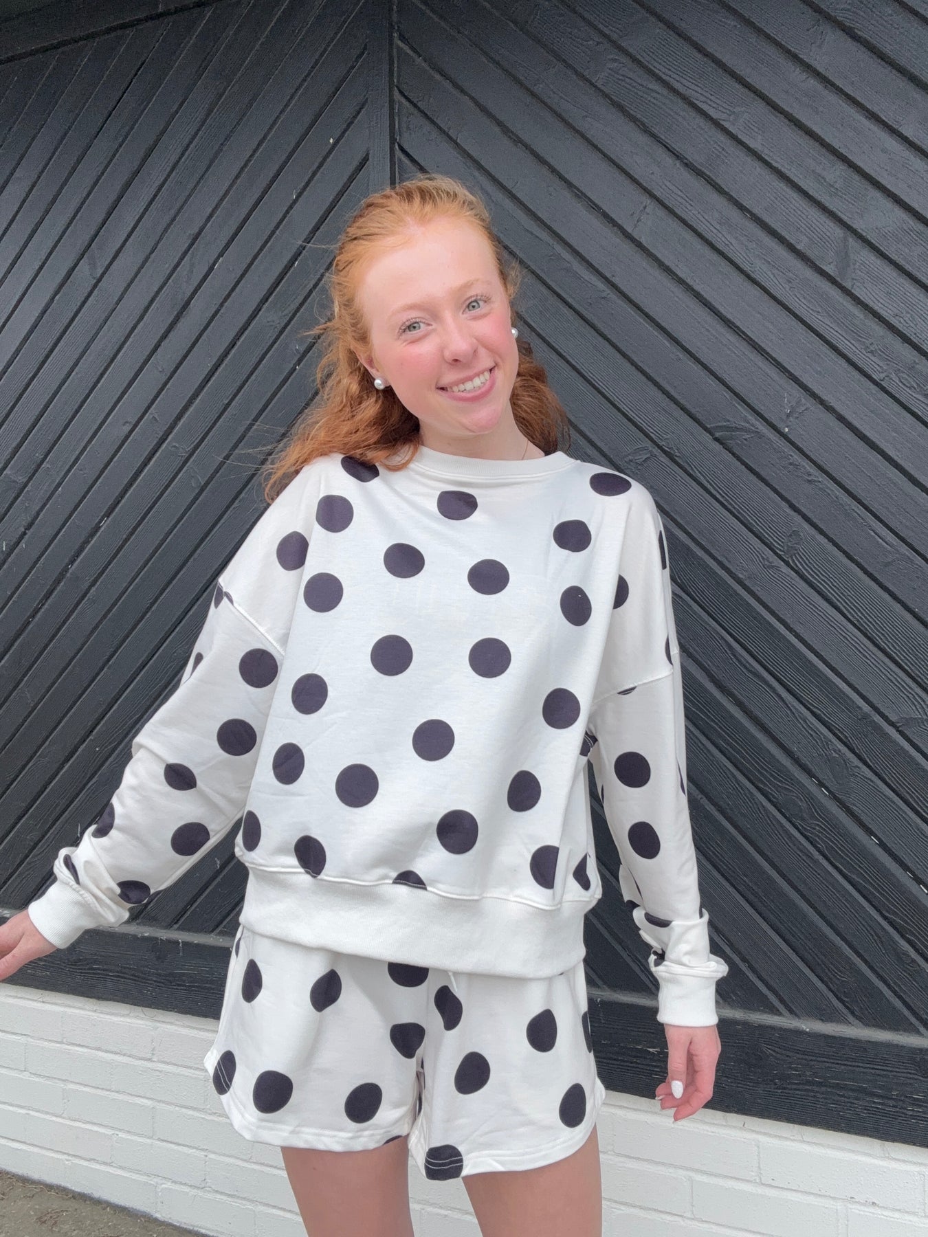 You are going to look amazing in this comfortable set! The polka dot pattern has been a favorite of ours lately!