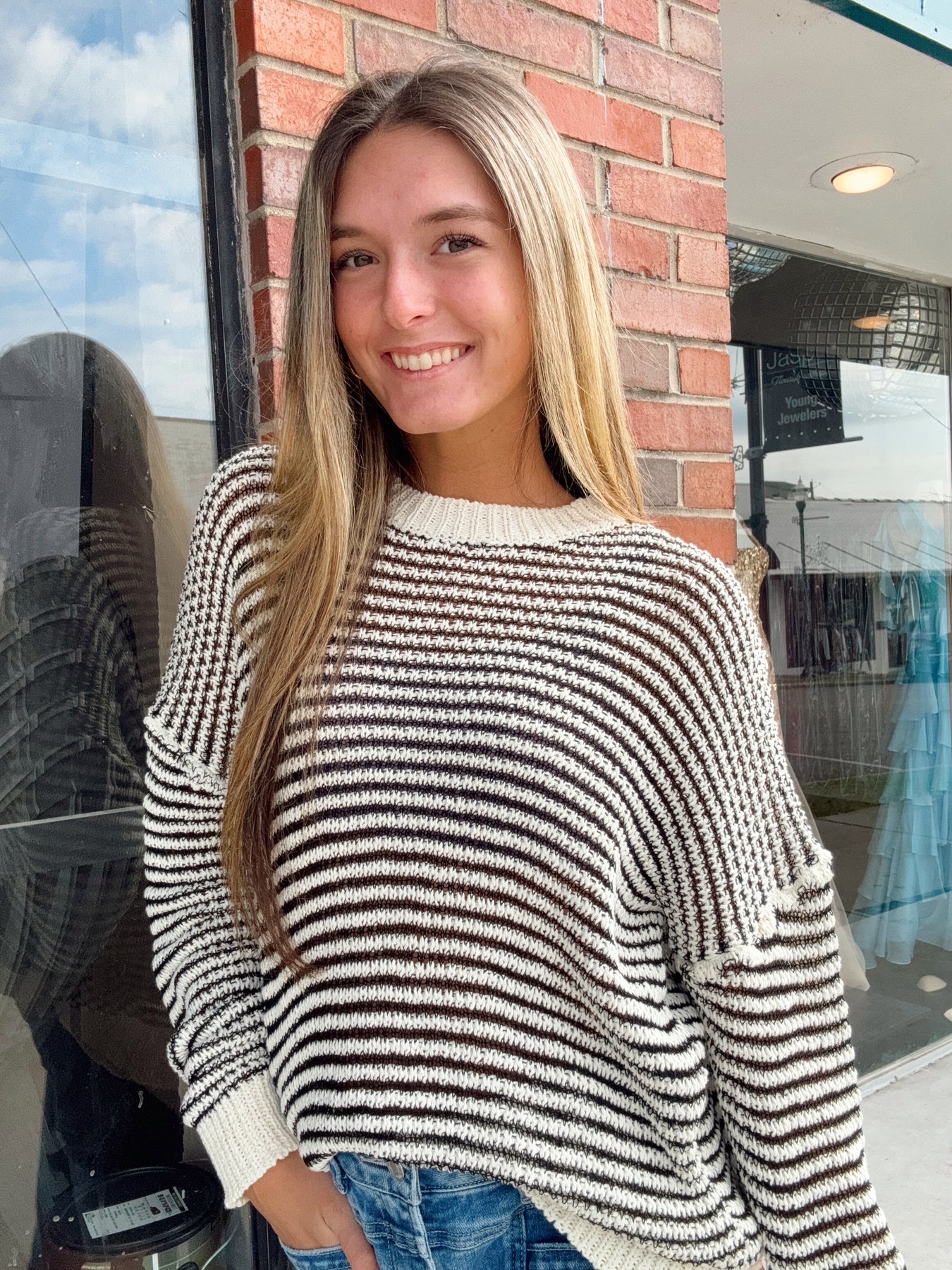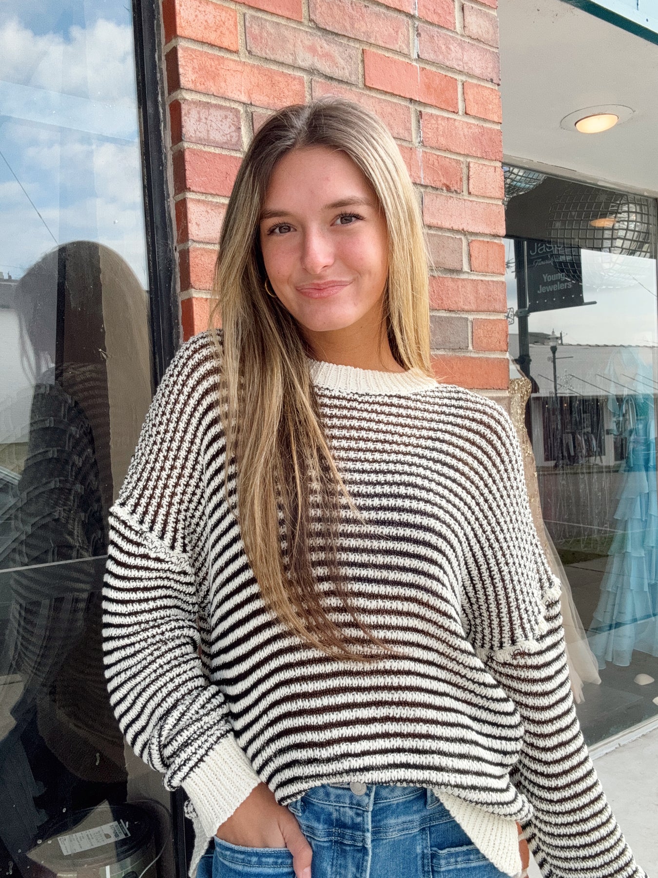 Style this sweater with some cute pants, sneakers, and jewelry! Complete the look with a purse!