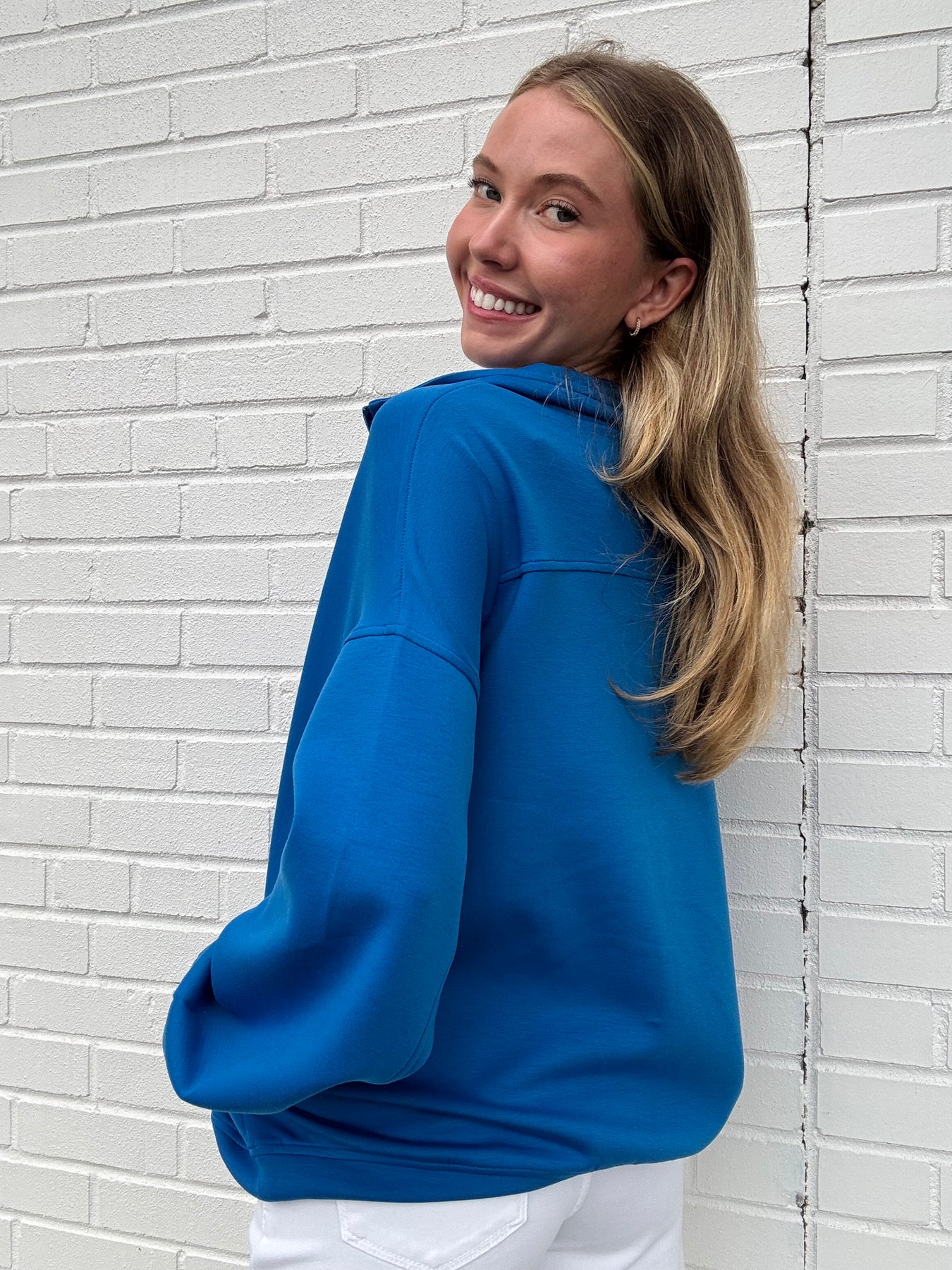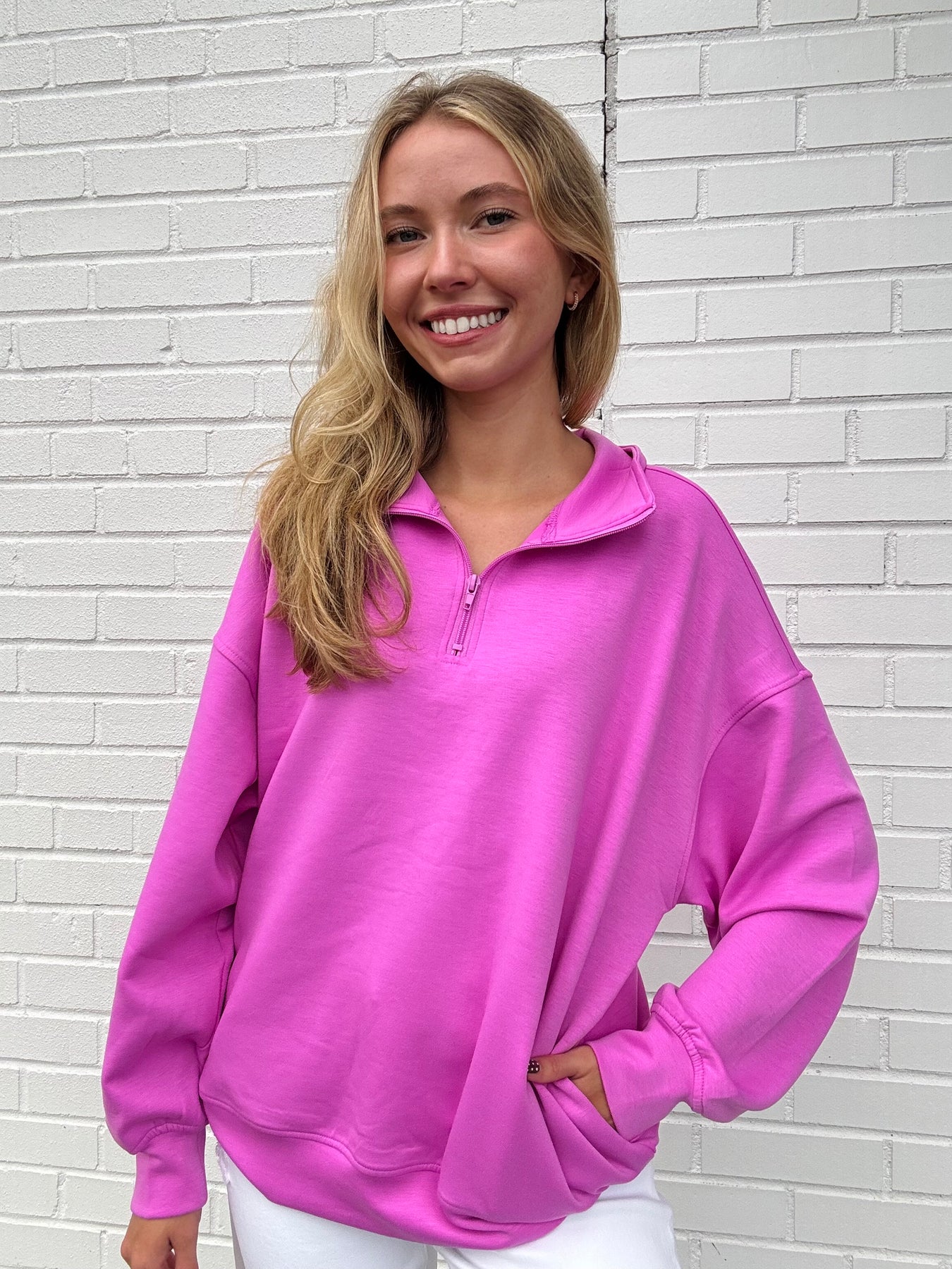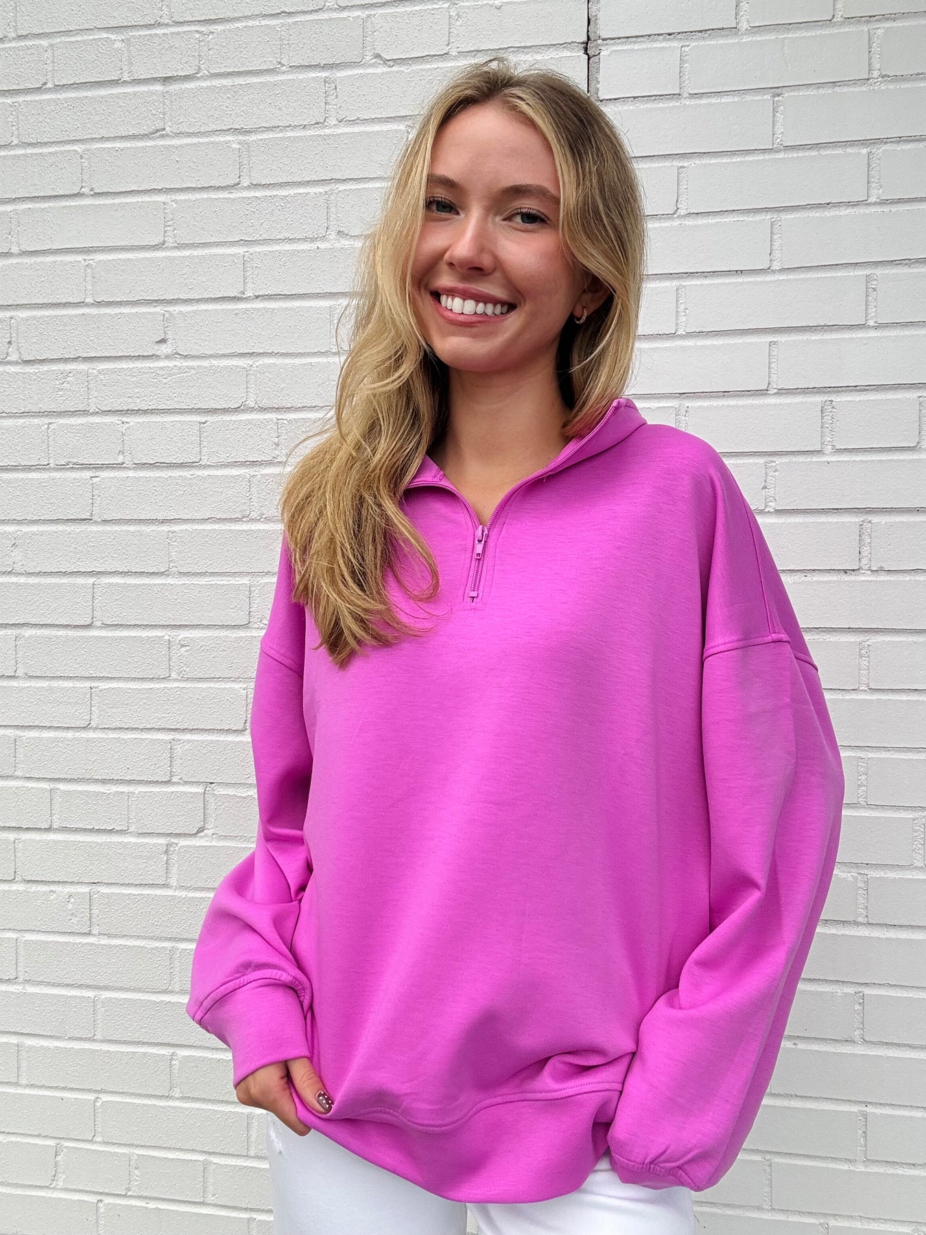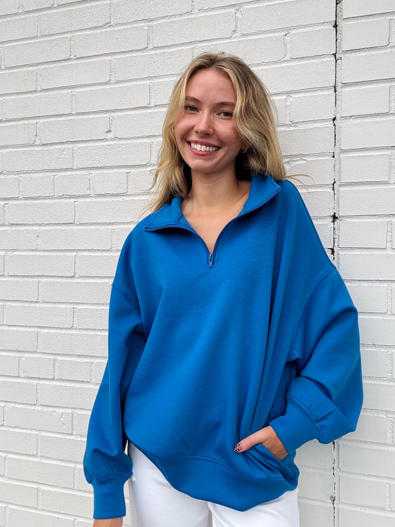 This is the perfect running errands/workout quarter zip!DETAILS:-collard-quater zip-pockets on the sides